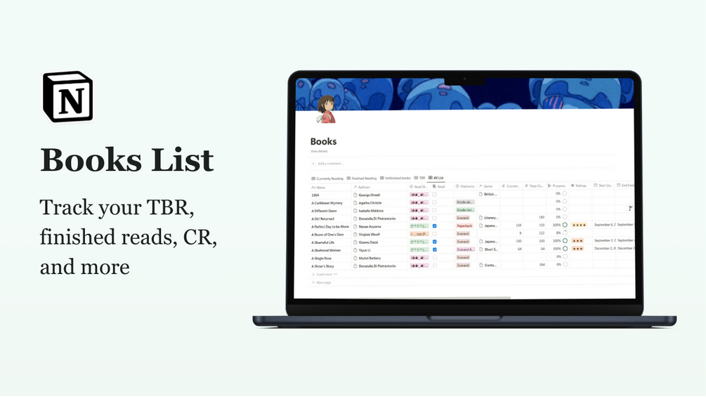 Enhance your reading experience with this beautifully crafted "Reading Log" designed with Studio Ghibli aesthetics. Perfect for book lovers who value organization and meaningful tracking. This template is made by a bookworm for fellow bookworms.